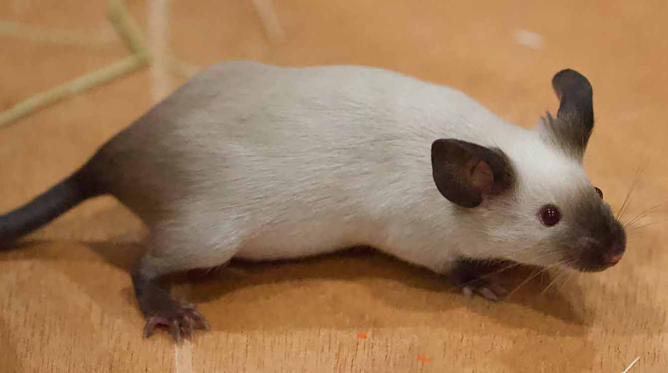 Siamese / Homozygous HimalayanSiamese mice range from off-white cream to white with dark points that range from light chocolate to black. Like other siamese-patterened animals, the darkest of the points varies on temperature, and is darker in colder months. Their eyes range from ruby to black.