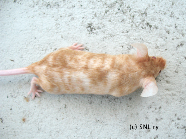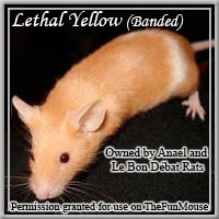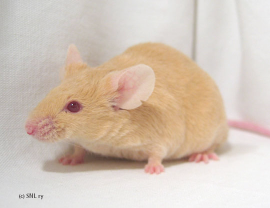 The other is a lethal yellow, made via combining lethal yellow (Ay/*), brown (b/b), chinchilla (cch/cch), and pink eye dilution (p/p). The mouse pictured to the right is this variant.