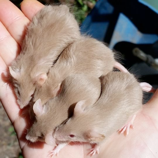 Show type mice have very large ears, arched backs, thick tails, broad faces, and tend to be larger than fancy type mice. In the image to the right, the leftmost mouse is a show type.